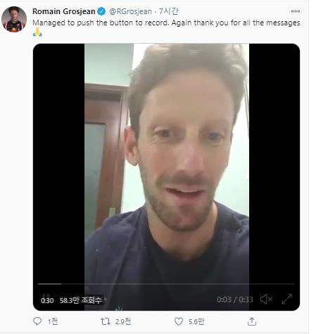 큰 부상은 물론 골절도 없이 양손 등에 화상만 입은 그로장은 2일(한국시간) 자신의 트위터에 영상을 남기고 "제가 손가락으로 직접 녹음 버튼을 눌렀다. 안부 인사를 보내준 모든 사람에게 감사드린다"라고 밝혔다.