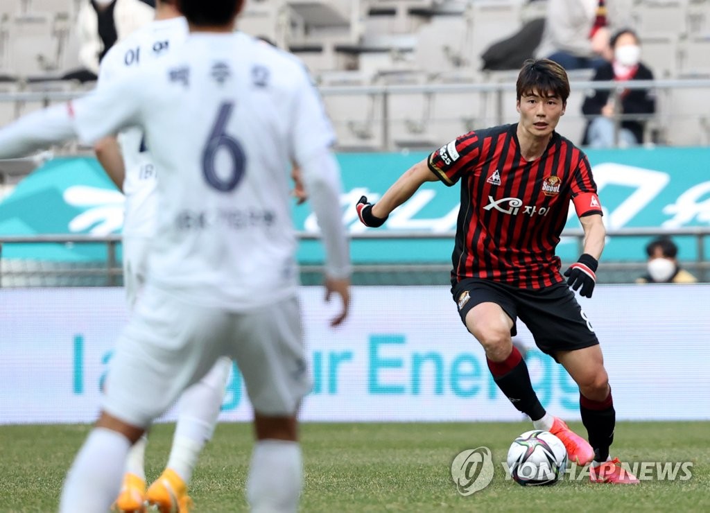 | ▲ Ki Sung-yueng of FC Seoul (R) dribbles the ball against Suwon FC during a K League 1 match at Seoul World Cup Stadium in Seoul on March 7, 2021. (Yonhap) |