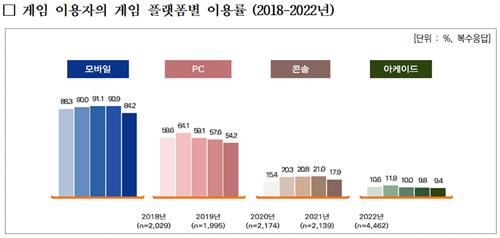 | ▲ 게임 이용자의 게임 플랫폼별 이용률(2018~2022) [한국콘텐츠진흥원 제공] |