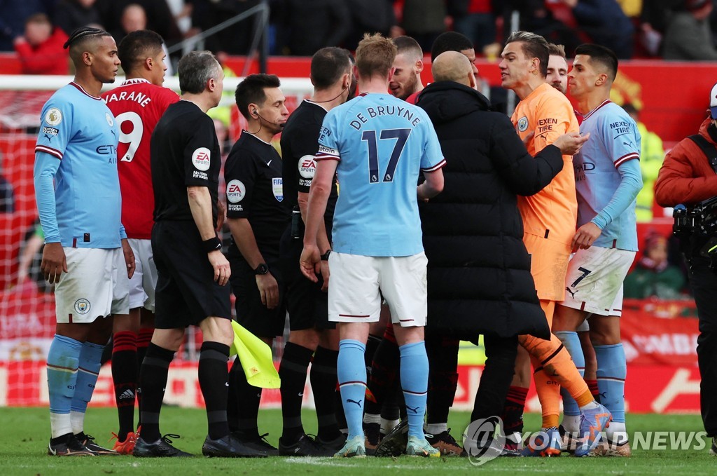 ▲ 경기 후 심판에게 따지는 맨시티 선수들 [로이터=연합뉴스]