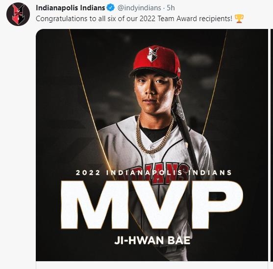 이날 피츠버그 산하 마이너리그 트리플A 인디애나폴리스 인디언스는 "이번 시즌 팀 최우수선수(MVP)로 배지환을 선정했다"고 밝혔다.