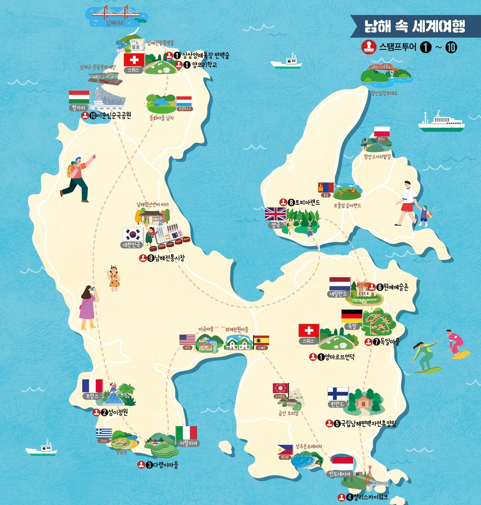 남해의 이국적인 관광명소를 외국 여행하듯이 방문하면서 인증 도장을 찍을 수 있게 한 설정이다.