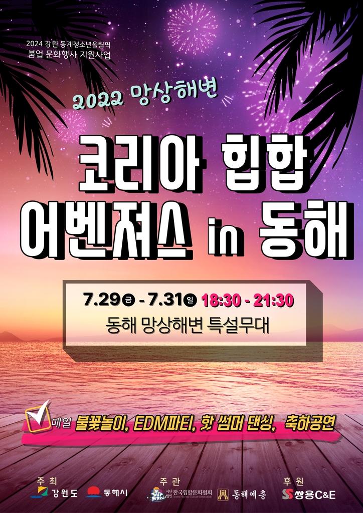 2024 강원동계청소년올림픽 붐업 문화행사의 하나로 열리는 '2022 망상해변 코리아 힙합 어벤져스 in 동해'는 첫날 전야제 축하 공연을 시작으로 둘째 날엔 브레이크댄스 배틀과 랩 컴피티션, 핫 썸머 모델 쇼가 펼쳐지고 마지막 날엔 올 장르 퍼포먼스 대회가 이어진다.