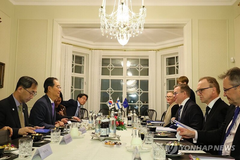 | ▲ South Korea's Prime Minister Han Duck-soo (2nd from L) speaks to Finnish Prime Minister Petteri Orpo (3rd from R) during their talks at the Finnish prime minister's official residence in Helsinki on Nov. 2, 2023, in this photo provided by Han's office. (PHOTO NOT FOR SALE) (Yonhap) |