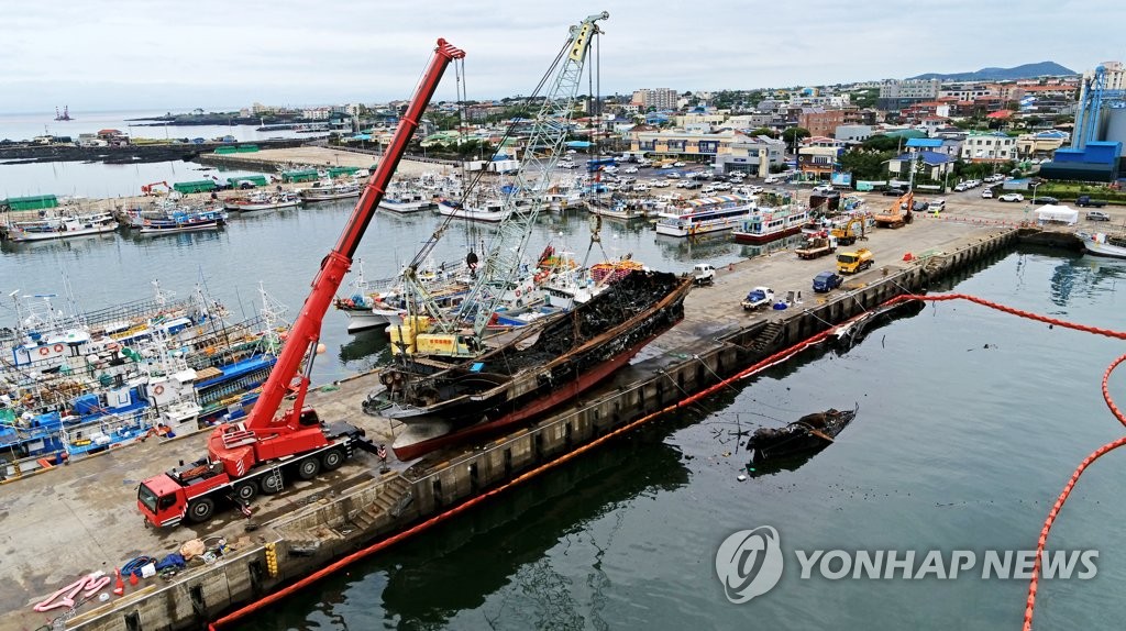 JEJU, South Korea, July 12 (Yonhap) -- The Coast Guard retrieved Tuesday a body believed to be of a crewman who went missing in a devastating fire at a port on the southern island of Jeju last week, officials said.