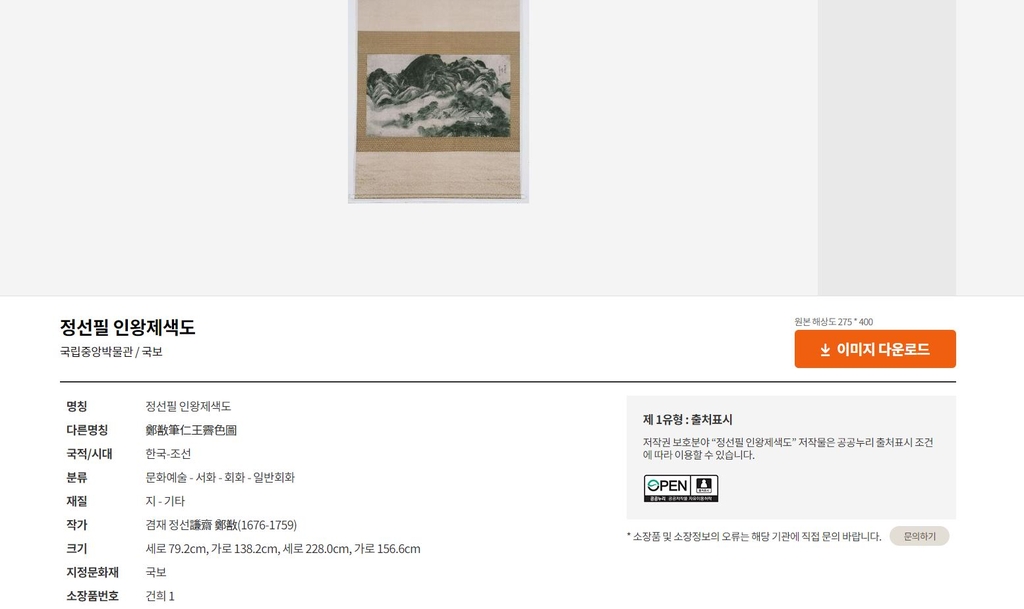 | ▲ '정선 필 인왕제색도' 검색 모습 [국립중앙박물관 제공. 재판매 및 DB 금지] |