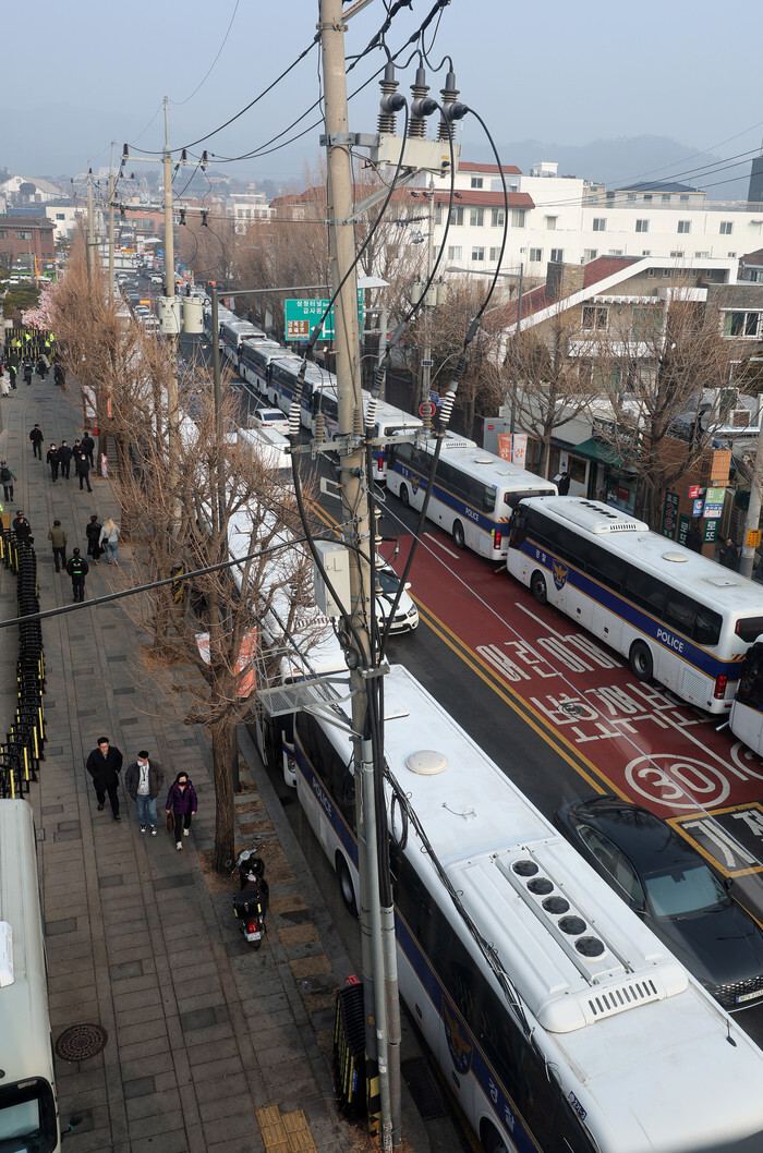 This photo, taken Jan. 21, 2025, shows barricades of police buses set up on a road near the Constitutional Court in Seoul, as arrested President Yoon Suk Yeol will attend the third hearing the same day of his impeachment trial in connection with his short-lived imposition of martial law in December. (Yonhap)