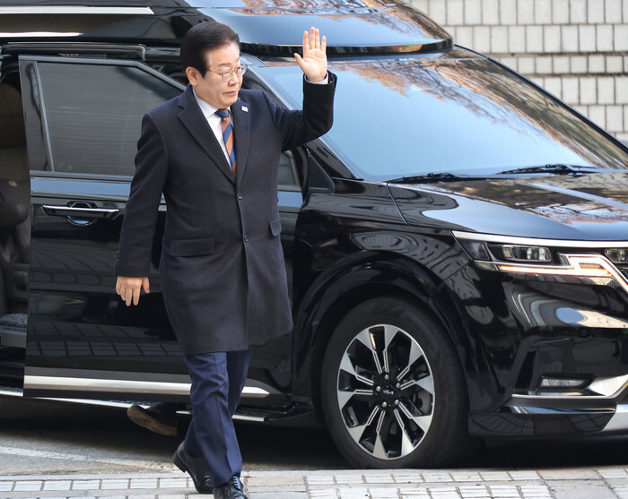 Lee Jae-myung, leader of the main opposition Democratic Party, waves as he appears at the Central District Court in Seoul on Jan. 17, 2025, to attend a hearing regarding corruption accusations related to realty projects while serving as the mayor of Seongnam in the mid-2010s. The allegations also involve bribe-taking from Seongnam FC, a football club. (Yonhap)