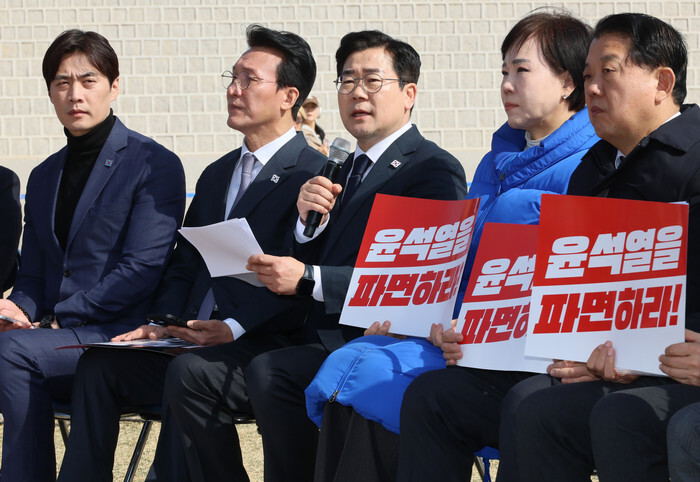 Park Chan-dae (C), floor leader of the main opposition Democratic Party, speaks during a meeting of the party's Supreme Council near Gwanghwamun, the main gate to Gyeongbok Palace of the 1392-1910 Joseon Dynasty, in Seoul on March 14, 2025, as the party has called for the Constitutional Court to uphold President Yoon Suk Yeol's impeachment in connection with his short-lived imposition of martial law in December. (Yonhap)