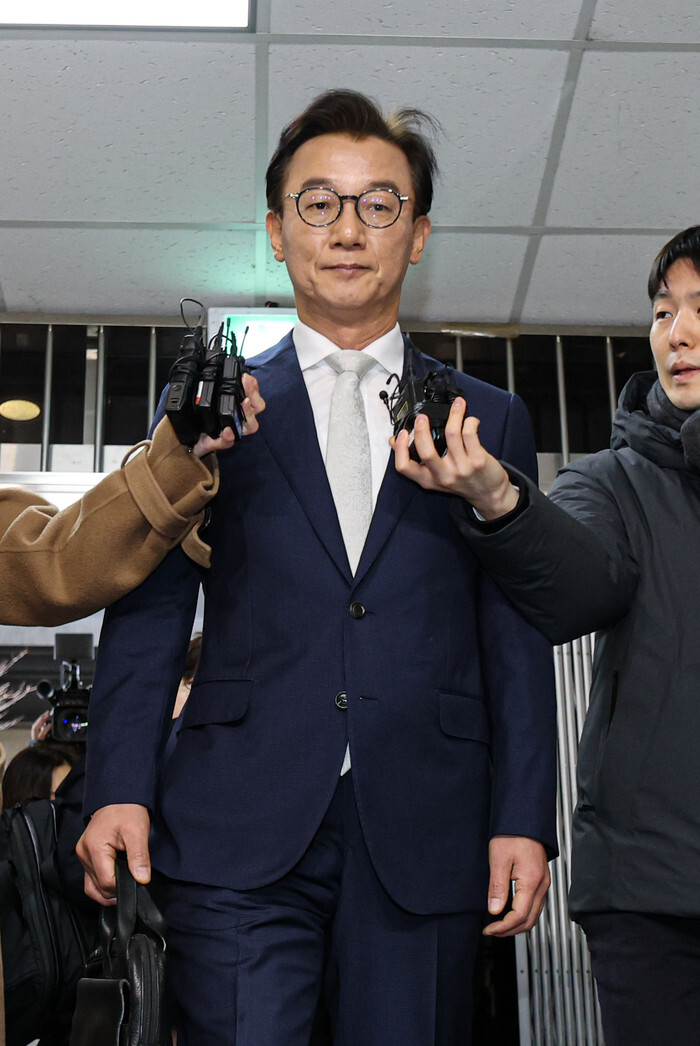 Former Oceans Minister Chun Jae-soo appears at the National Police Agency in Seoul on Dec. 19, 2025, to be questioned as a suspect over allegations he took bribes from the Unification Church in 2018. (Pool photo) (Yonhap)