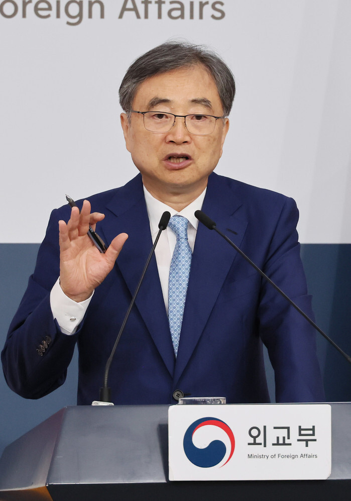 Foreign Minister Cho Hyun speaks during a press conference at the ministry in Seoul on Aug. 14, 2025. (Yonhap)