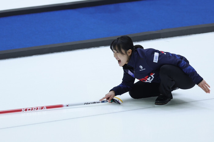 South Korean skip Gim Eun-ji gives instructions to her teammates during the team's round-robin match against Canada at the LGT World Women's Curling Championship at Uijeongbu Indoor Ice Rink in Uijeongbu, northeast of Seoul, on March 19, 2025. (Yonhap)