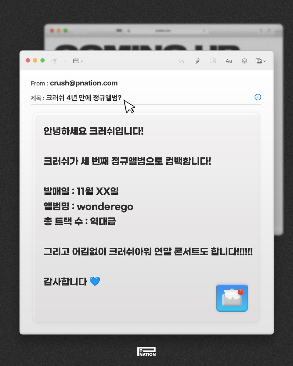 크러쉬는 공식 SNS를 통해 내달 세 번째 정규 음반 '원더이고'(wonderego)를 발매할 예정이라고 전했다.