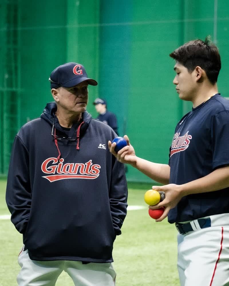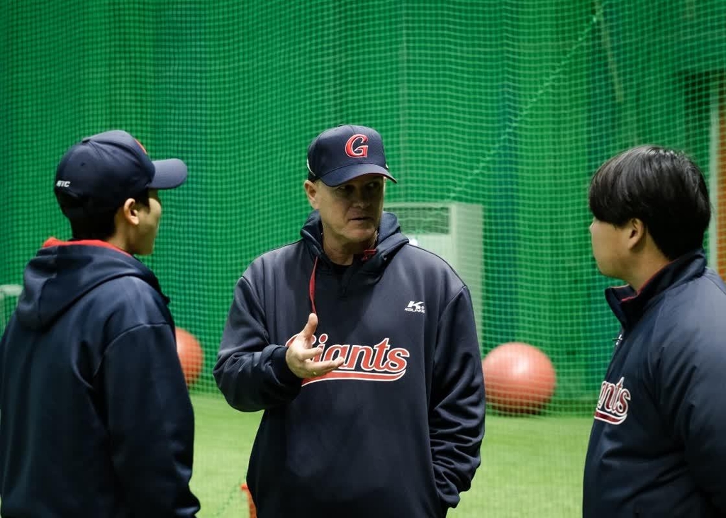 | ▲ Larry Sutton (L), manager of the Lotte Giants' Futures League affiliate, speaks to a player during spring training at Sangdong Stadium in Gimhae, 450 kilometers southeast of Seoul, on Feb. 4, 2021, in this photo provided by the Giants. (PHOTO NOT FOR SALE) (Yonhap) |