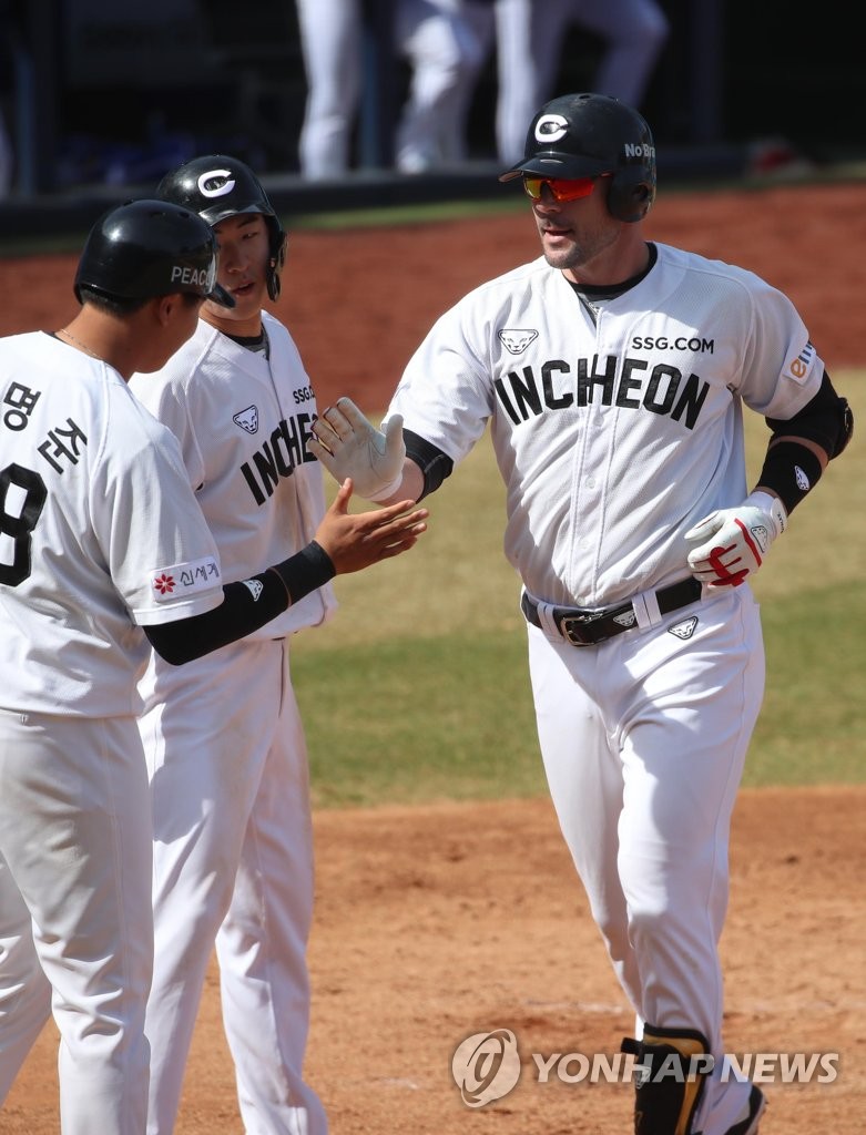 | ▲ Jamie Romak of the SSG Landers (R) is greeted at home plate by teammate Yoo Seo-jun (C) and Ko Myoung-jun after hitting a three-run home run against the Samsung Lions in the top of the sixth inning of a Korea Baseball Organization spring training game at Daegu Samsung Lions Park in Daegu, 300 kilometers southeast of Seoul, on March 16, 2021. (Yonhap) |