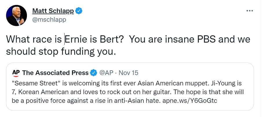 그는 이 프로그램의 고정 인기 캐릭터 '버니'와 '버트'는 "어떤 인종이냐"고 되물으며 "PBS는 제정신이 아니다. 우리는 PBS에 대한 자금 지원을 중단해야 한다"고 주장했다.