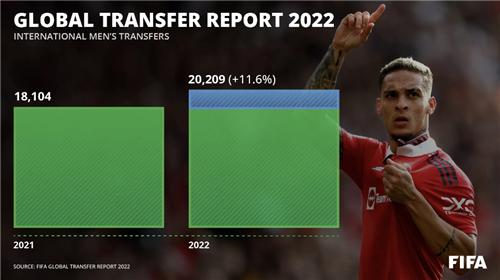 국제축구연맹(FIFA)이 27일(한국시간) 발표한 '2022년 세계 이적시장 보고서'에 따르면 지난 한 해 남자 프로선수의 국가 간 이적 건수는 2만209건으로 사상 처음으로 2만건을 넘어섰다.