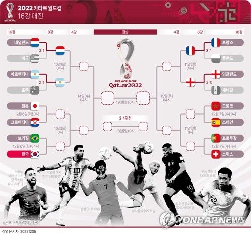 | ▲ [그래픽] 2022 카타르 월드컵 16강 대진 (서울=연합뉴스) 김영은 기자 = 잉글랜드가 5일(이하 한국시간) 세네갈을 3-0으로 제압하고 2022 카타르 월드컵 8강에 진출했다. 잉글랜드의 다음 상대는 이날 폴란드를 3-1로 격파하고 올라온 프랑스다. 0eun@yna.co.kr 트위터 @yonhap_graphics 페이스북 tuney.kr/LeYN1 |