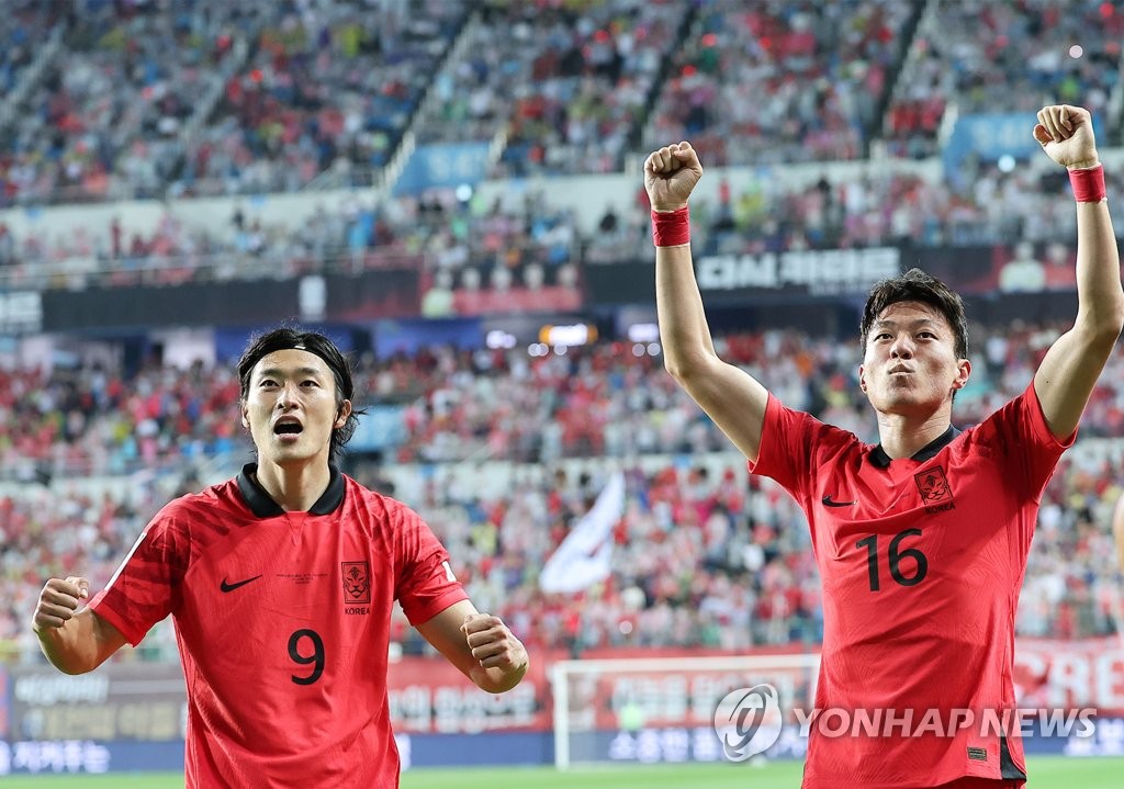 | ▲ 황의조, 득점 환호 (대전=연합뉴스) 류영석 기자 = 지난달 20일 대전월드컵경기장에서 열린 축구 국가대표팀 평가전 한국과 엘살바도르의 경기. 후반전 황의조(오른쪽)가 선제골을 넣은 뒤 조규성과 함께 환호하고 있다. 2023.6.20 ondol@yna.co.kr |