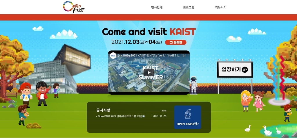 (대전=연합뉴스) 김준호 기자 = 한국과학기술원(KAIST)이 오는 3∼4일 교내 16개 연구 현장을 온라인으로 공개하는 '오픈 카이스트(OPEN KAIST) 2021' 행사를 개최한다.