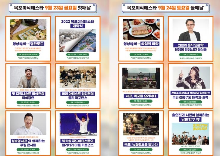 24일에는 8명의 목포 음식 명인이 전하는 '목포 맛 이야기', 역사 스토리텔러 썬킴의 음식인문학강의 '전쟁이 탄생시킨 음식들' 등이 이어진다.