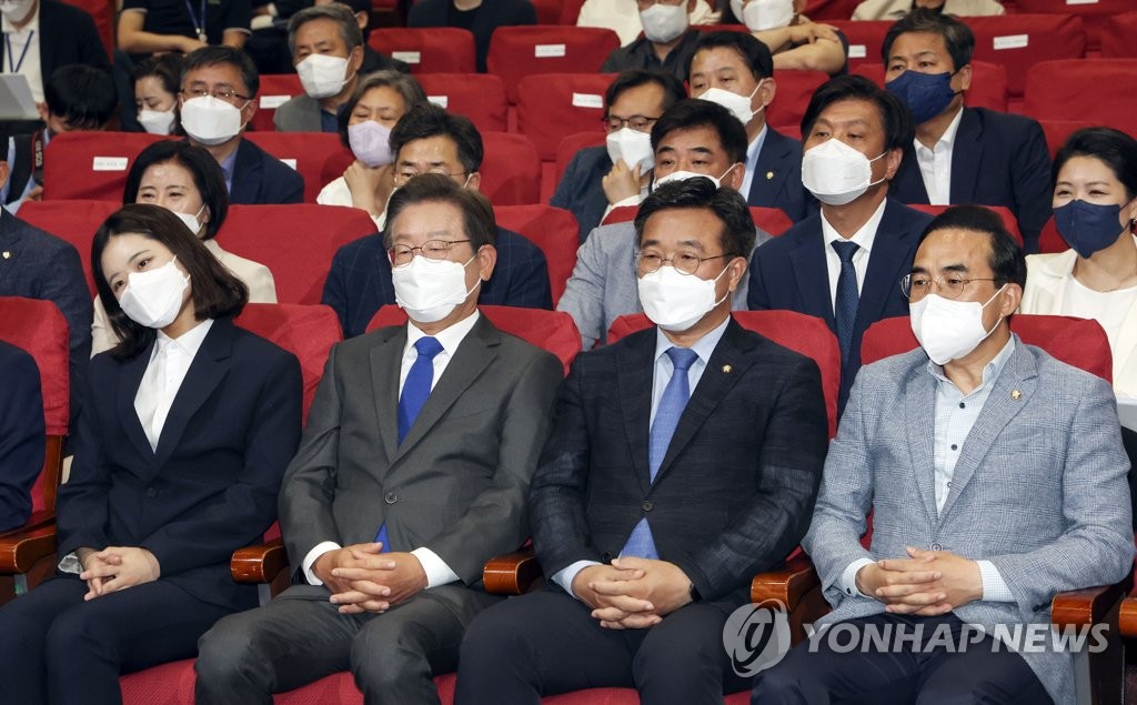| ▲ Leaders of the main opposition Democratic Party watch the exit poll results for the local elections at the National Assembly in Seoul on June 1, 2022. (Yonhap) |