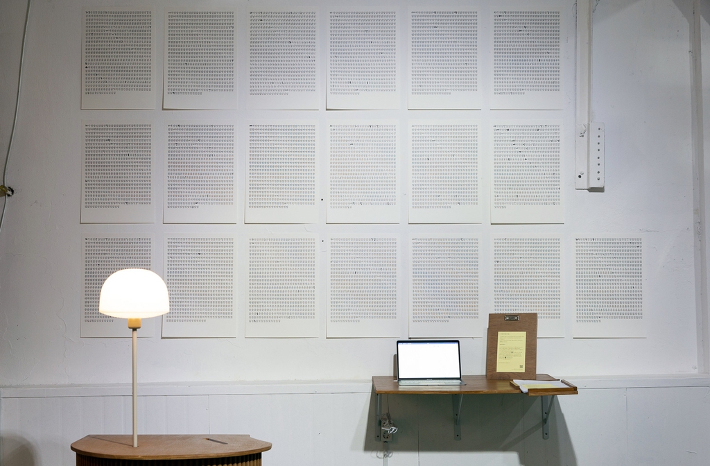 한편에 설치된 조그만 탁자 위에 노트북 1대와 작품 설명서가 놓여 있고, 그 앞 벽면에 한글 서체가 프린트된 A4용지들이 붙어 있다. '필사를 위한 형태'라는 조혜진 작가의 작품이다.