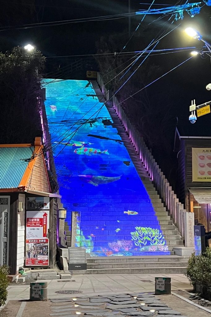 포항문화재단은 이달부터 매주 금∼일요일 저녁에 남구 구룡포읍 일본인가옥거리 중앙계단에서 미디어아트를 시범 상영하고 있다고 19일 밝혔다.