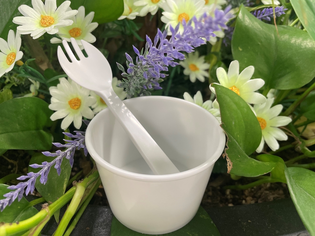 | ▲ This photo, provided by SKC Co. on Dec. 25, 2022, shows a plastic bowl and fork set made with SKC's biodegradable polymer. (PHOTO NOT FOR SALE) (Yonhap) |