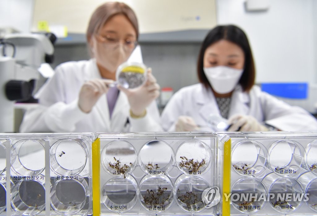 ▲ In this file photo, researchers conduct an experiment on malaria mosquitoes at a lab of a state health research center in Suwon, south of Seoul, on Aug. 16, 2023. (Pool photo) (Yonhap)