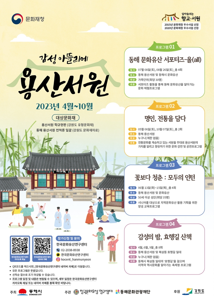 향교·서원 문화재 활용 사업은 동해시가 주최하고 한국문화유산연구센터와 동해문화관광재단에서 주관하며 문화재청과 강원도에서 후원하는 사업으로 2015년부터 9년 연속 공모에 선정됐다.