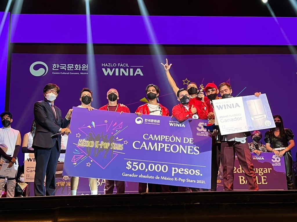 | ▲ '멕시코 K팝 스타' 대회 우승팀 (멕시코시티=연합뉴스) 14일(현지시간) 멕시코시티 메트로폴리탄 대극장에서 열린 '멕시코 K팝 스타' 대회에서 최종 우승한 '데인저러스 보이스'가 서정인 주멕시코 대사(왼쪽)과 기념사진을 찍고 있다. 2021.11.15 [주멕시코 한국문화원 제공] mihye@yna.co.kr |