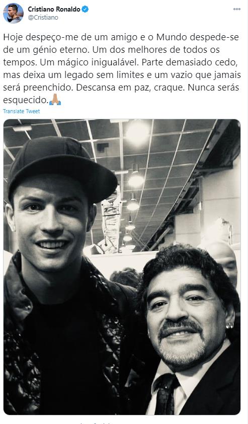 호날두는 "오늘 나는 친구와 작별했고 세계는 영원한 천재와 작별했다"며 "그는 너무 일찍 떠났지만 무한한 유산과 채워질 수 없는 빈자리를 남겼다. 당신을 절대로 잊지 않겠다"고 말했다.