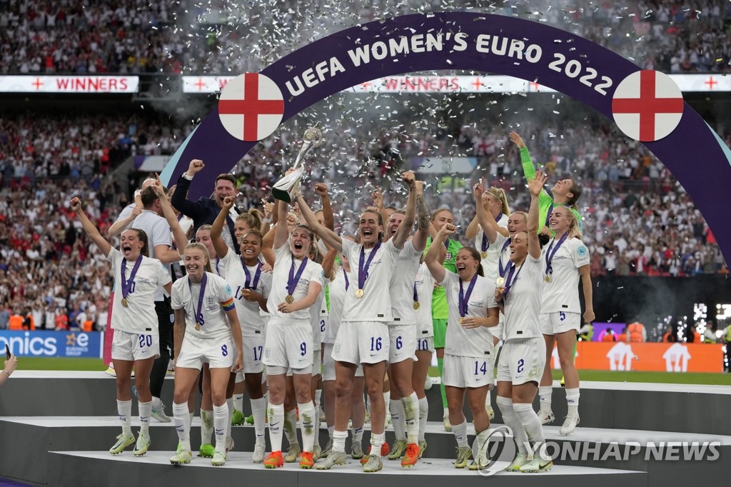 | ▲ '2022 여자 유로'서 사상 첫 우승 거둔 잉글랜드 (런던 AP=연합뉴스) 지난달 31일(현지시간) 영국 런던 웸블리 스타디움에서 열린 2022 잉글랜드 여자 유럽축구선수권대회(여자 유로) 잉글랜드 대 독일 결승전에서 잉글랜드 여자대표팀이 우승을 거둔 뒤 트로피를 들고 기뻐하고 있다. 잉글랜드는 독일을 2-1로 물리치고 사상 처음 유럽 챔피언에 올랐다. 2022.08.01 ddy04002@yna.co.kr |