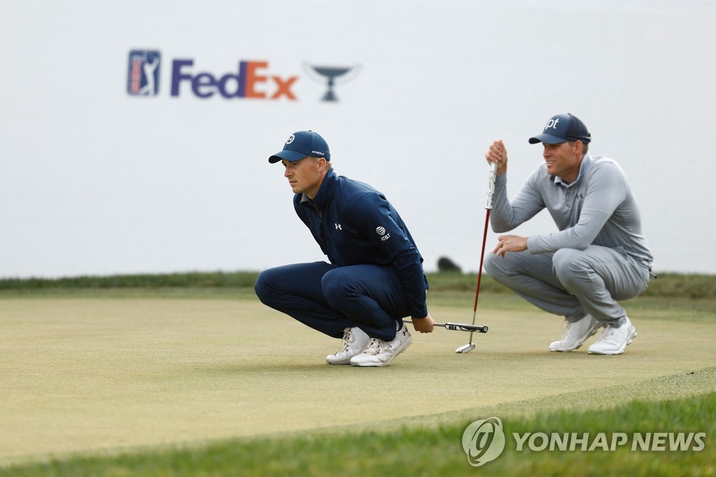 | ▲ 18번홀에서 퍼트를 준비하고 있는 조던 스피스(왼쪽)와 애덤 솅크. [Getty Images via AFP=연합뉴스] |