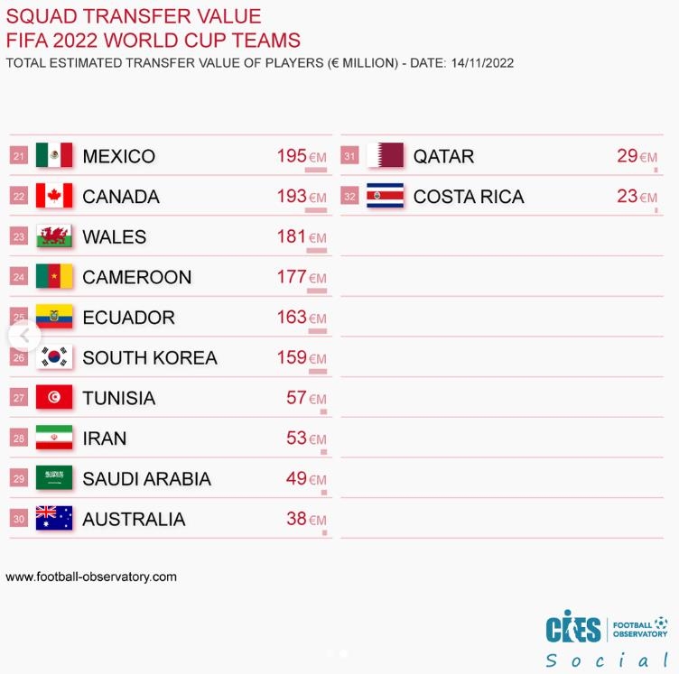 가장 대표팀의 도합 이적료가 낮은 출전국은 2천300만유로(약 318억원)의 코스타리카였다. 개최국 카타르가 2천900만유로(약 400억원)로 코스타리카 바로 위에 자리했다.