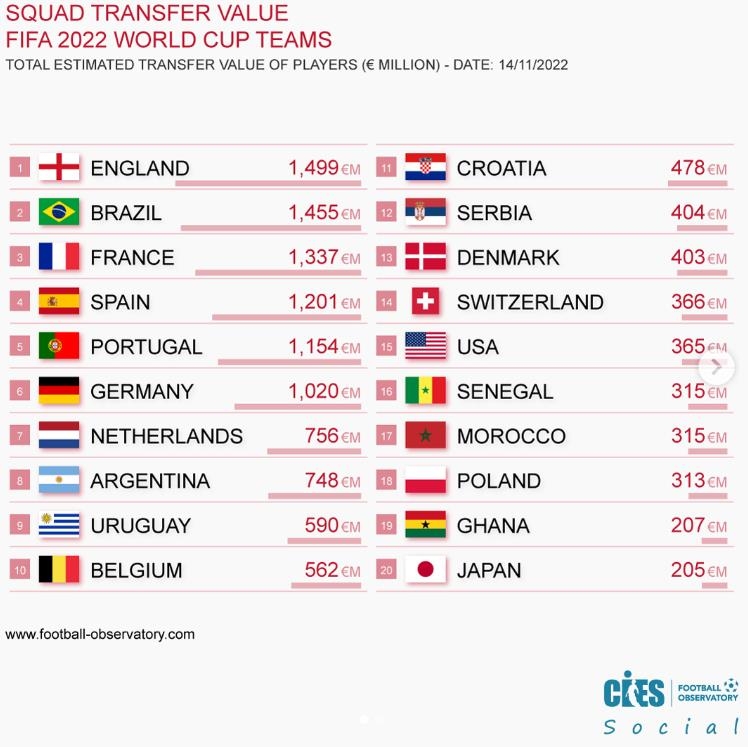 국제축구연맹(FIFA) 산하 국제스포츠연구소(CIES)는 16일(현지시간) 홈페이지를 통해 이번 월드컵에 출전한 32개국 선수단의 전체 이적료 가치(transfer value)를 발표했다.