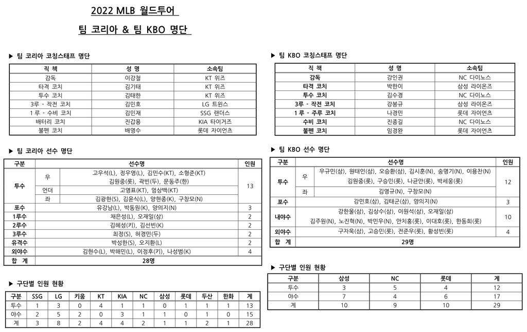 이강철 kt 감독이 이끄는 팀 코리아는 투수 13명, 포수 3명, 내야수 8명, 외야수 4명 등 28명으로 꾸려졌다.
