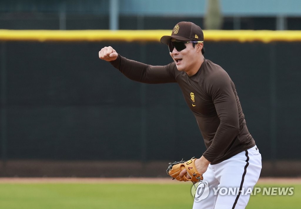 | ▲ 김하성, WBC도 이 '파이팅' 그대로 (피오리아[미국 애리조나주]=연합뉴스) 홍해인 기자 = 21일(현지시간) 미국 애리조나주 피오리아 스포츠 콤플렉스에서 열린 미국 메이저리그(MLB) 샌디에이고 파드리스의 스프링 캠프 훈련. 내야수 김하성이 수비 훈련을 하며 밝은 표정으로 주먹을 쥐어 보이고 있다. 2023.2.22 hihong@yna.co.kr |