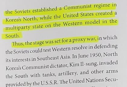 '리서치 & 교육협회'(REA)가 발행한 '세계사' AP 시험 교재 114쪽에는 한국전쟁을 "대표적인 미국과 소련의 대리전"이라고 서술하며 비슷한 예시로 "베트남 전쟁과 앙골라 내전"을 제시했다.