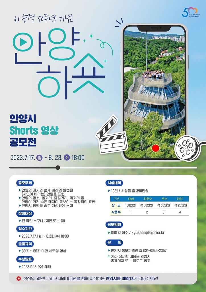 (안양=연합뉴스) 김인유 기자 = 경기 안양시는 시 승격 50주년을 기념해 60초 미만의 세로형 짧은 영상인 숏츠(Shorts) 공모전 '안양하숏!'을 진행한다고 13일 밝혔다.