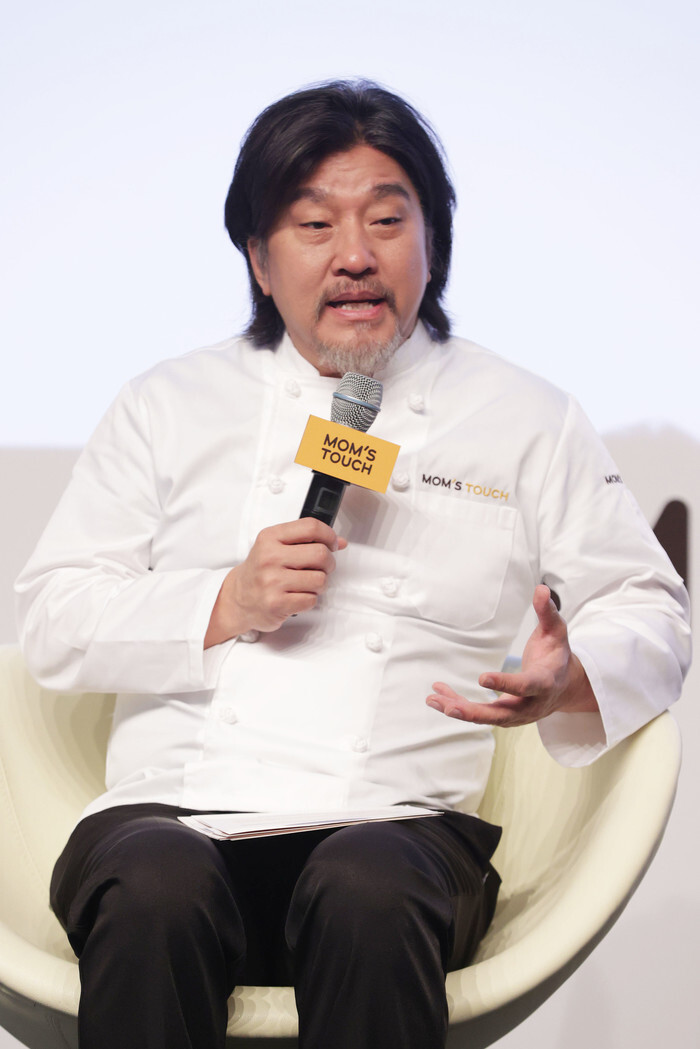 Korean American star chef Edward Lee speaks at a Seoul hotel on Jan. 21, 2025, during a publicity event to launch his new dishes made in cooperation with Mom's Touch, a South Korean fast food chain. (Yonhap)