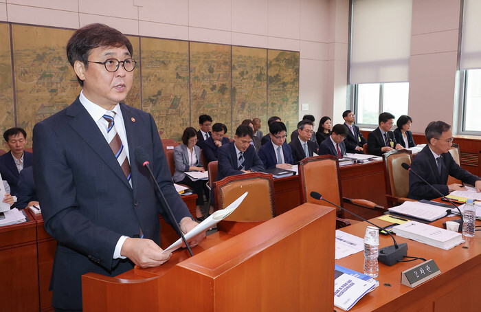 Culture, Sports and Tourism Minister Chae Hwi-young speaks during a parliamentary inspection of his agency by the Culture, Sports and Tourism Committee at the National Assembly in Seoul on Oct. 14, 2025. (Yonhap)