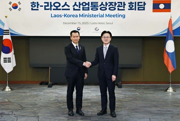 South Korean Industry, Trade and Energy Minister Kim Jung-kwan (R) poses for a photo with his Laotian counterpart, Malaithong Kommasith, during their talks in Seoul on Dec. 15, 2025, in this photo released by the industry ministry. (PHOTO NOT FOR SALE) (Yonhap)