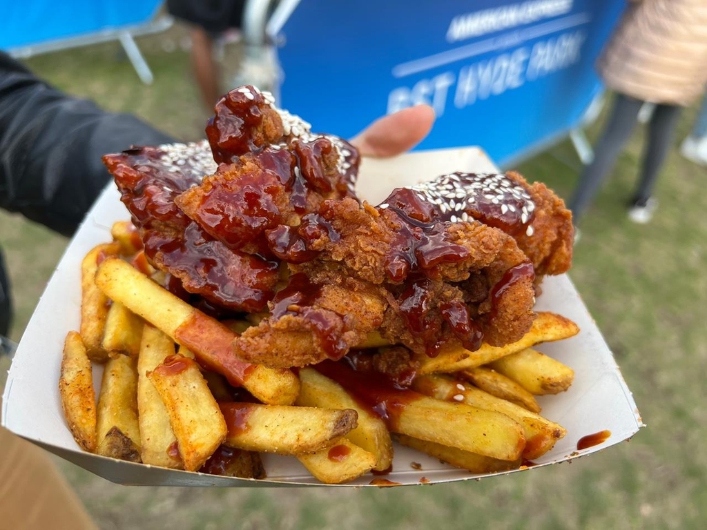 행사장 음식 부스 중에선 버거, 한국 치킨 텐더 등 '한국 거리 음식'(Korean Street Food)이라고 이름 붙여둔 곳에만 유독 줄이 길었다. 오후 6시께 다른 음식을 파는 부스에선 거의 대기가 없었는데 이곳에는 20명 넘게 기다리고 있었다.