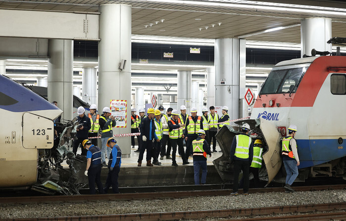 Railway workers inspect damage caused by a minor collision between trains at Seoul Station in the capital on April 18, 2024. (Yonhap)