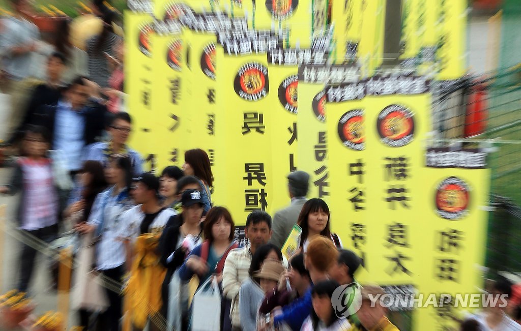 | ▲ 한신 타이거스 스프링캠프 메인 구장을 찾은 일본 팬들 2015년 2월 23일 일본 프로야구 한신 타이거스의 스프링 캠프가 열리는 일본 오키나와현 기노자 구장 앞에 팬들이 선수들을 기다리는 가운데 오승환의 이름이 적힌 현수막이 바람에 펄럭이고 있다. [연합뉴스 자료사진] |
