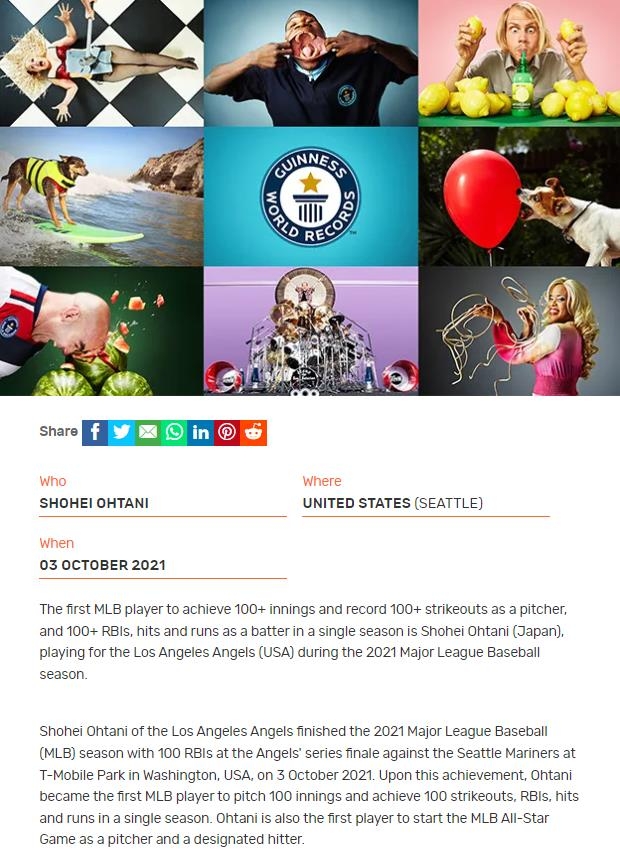 | ▲ 기네스북에 오른 오타니 [기네스월드레코드닷컴 홈페이지 캡처. 재판매 및 DB 금지] |