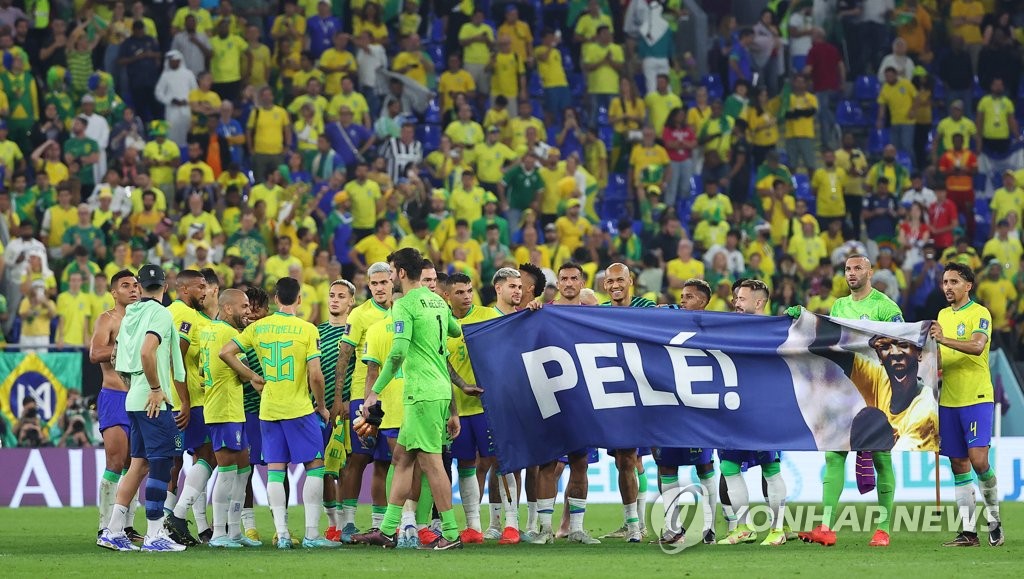 | ▲ 펠레 쾌유 바라는 브라질 선수들 (도하=연합뉴스) 김도훈 기자 = 6일(한국시간) 카타르 도하 974스타디움에서 열린 2022 카타르 월드컵 16강전 대한민국과 브라질의 경기가 끝난 뒤 브라질 선수들이 펠레의 쾌유를 기원하는 현수막을 들고 있다. 2022.12.6 superdoo82@yna.co.kr |