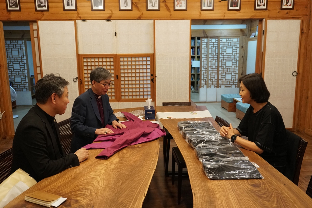 ▲ 대한성공회에 친환경 사제복을 전달한 코오롱FnC부문 한경애 최고전략책임자(CSO) [코오롱인더스트리 FnC부문 제공. 재판매 및 DB 금지]